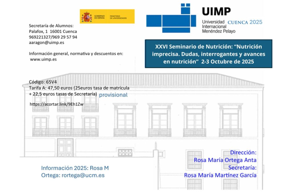 Ponencias PRÓXIMAMENTE: XXVI Seminario de Nutrición: “Nutrición imprecisa. Dudas, interrogantes y avances en nutrición” 22/05/2025 2-3 de octubre de 2025 UIMP, sede Cuenca El programa se publicará en cuanto esté disponible *Información y precios provisionales También te gustaráResumen de las ponencias de las 10ª Jornadas UCM-ASEN (2023)Resumen de las ponencias de las 11ª Jornadas UCM-ASEN (2024)Resumen de las ponencias de las 6ª Jornadas UCM-ASEN (2019)